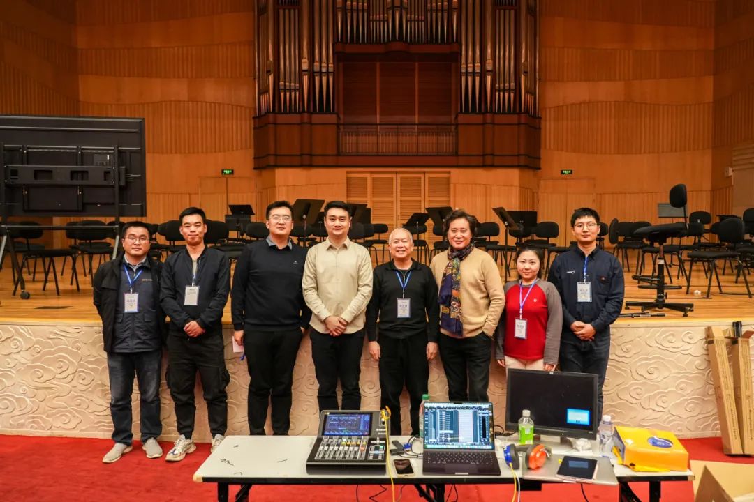 赵平老师、录音师陈曦与音王的技术人员正在调试接通调音台与3D拾音装置、沉浸声拾音装置,确保录音工作的稳定与真实还原。